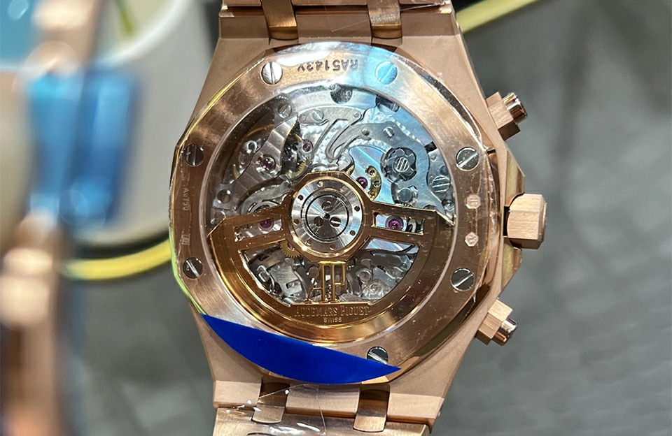 錶背採用玫瑰金材質,為整體設計增添了一抹奢華氣息,而藍寶石玻璃錶面則兼具高耐刮性與清晰度。綠色錶盤呈現無數字設計,既簡約又充滿高貴氣質,展現皇家橡樹系列獨特的魅力,充分彰顯佩戴者與眾不同的品味。