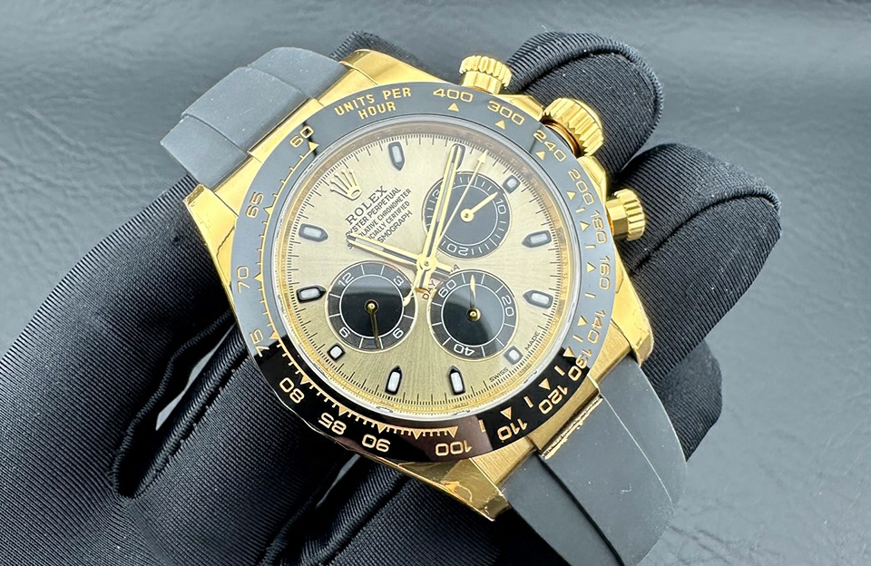 這款手錶的錶面採用藍寶石玻璃,耐磨損且清晰可見,金色的錶盤優雅奪目,無論在何種場合都能引人注目。904L鋼的錶殼物料,不僅增加了耐用性,更使整體外觀更加奢華。搭配舒適的橡膠錶帶,讓佩戴者享受絕佳的佩戴體驗。