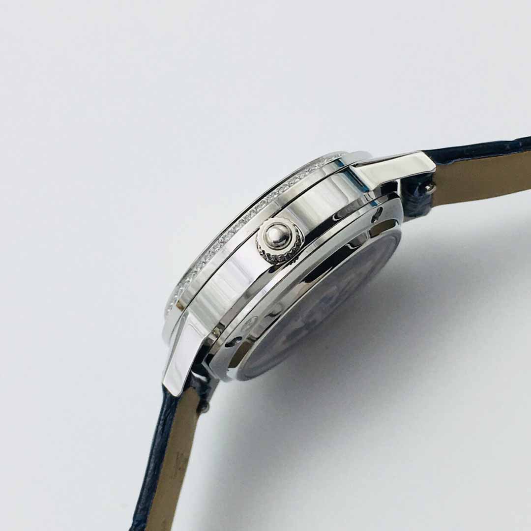 【錶殼】腕錶尺寸29毫米,厚度8.9毫米,簡約幹練的外殼打磨精細,確保打磨工藝吻合,質感同步正品。表圈一共鑲有60顆頂級施華洛世奇美鑽共重0.69 克拉。鑲工嚴謹,還原正品最美風采。